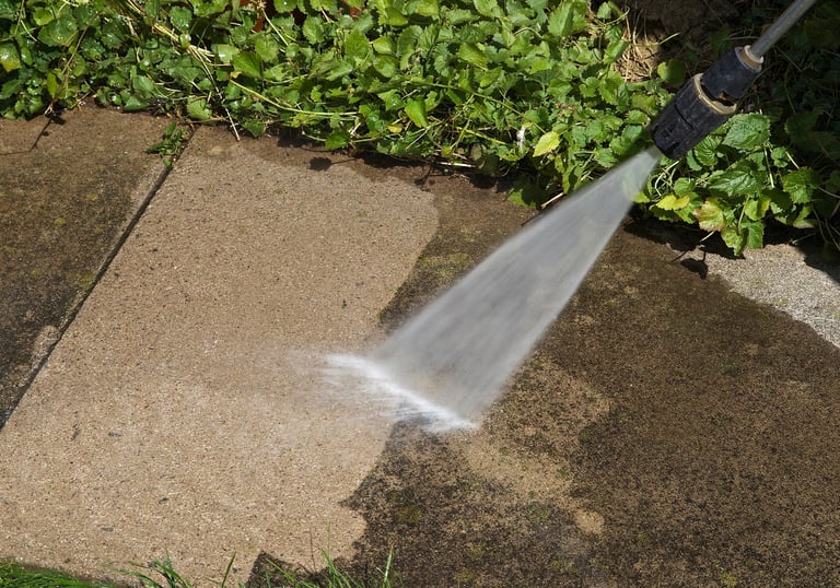 Deep cleaning surfaces with high-pressure water to remove dirt, mold, and stains.